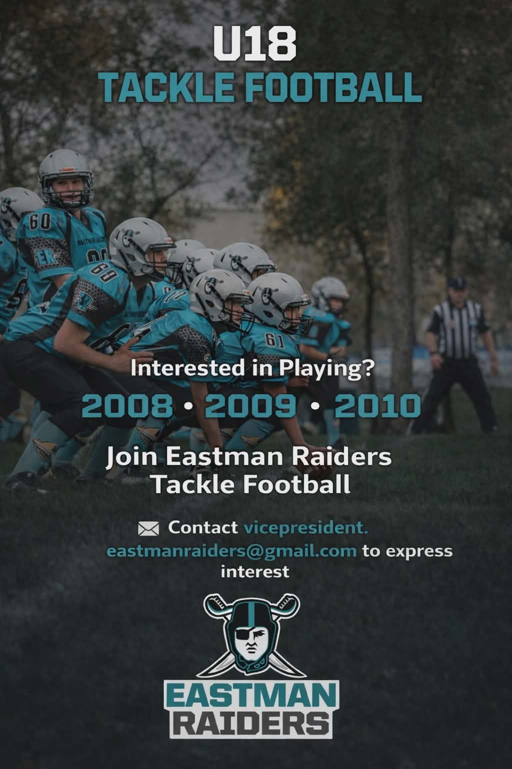 Help Us Build a U18 Team!The Eastman Raiders are exploring the possibility of a U18 tackle football team — but we need your help!If you have a player born in 2008, 2009, or 2010 who is interested, please let us know. Email vicepresident.eastmanraiders@gmail.com We need to hear from you to make this… Learn More